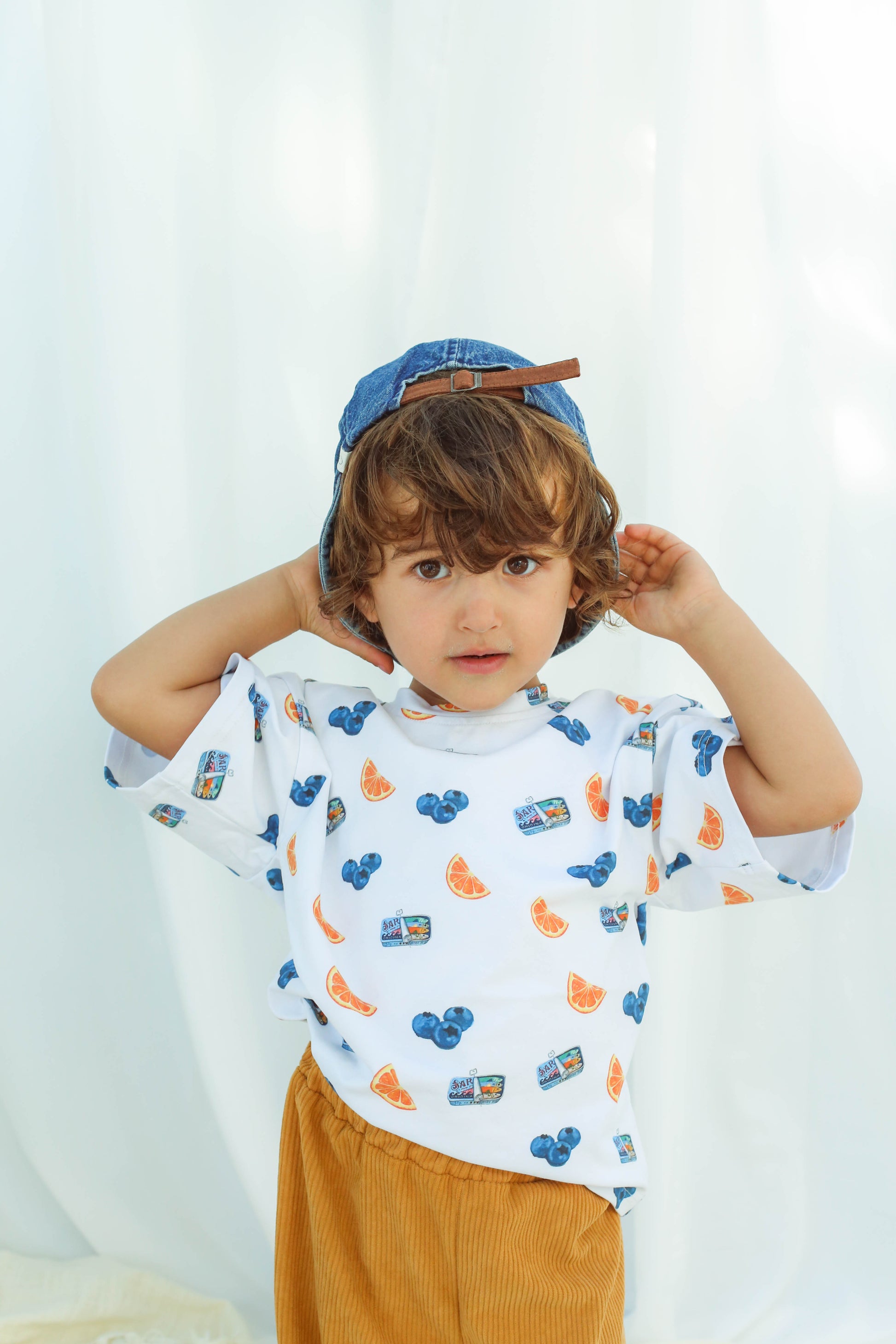 The oversized buttery-soft t-shirt features a playful prints of oranges,blueberries and sardines. Paired with a burnt orange corduroy pants, this set balances bold hues with cozy textures.