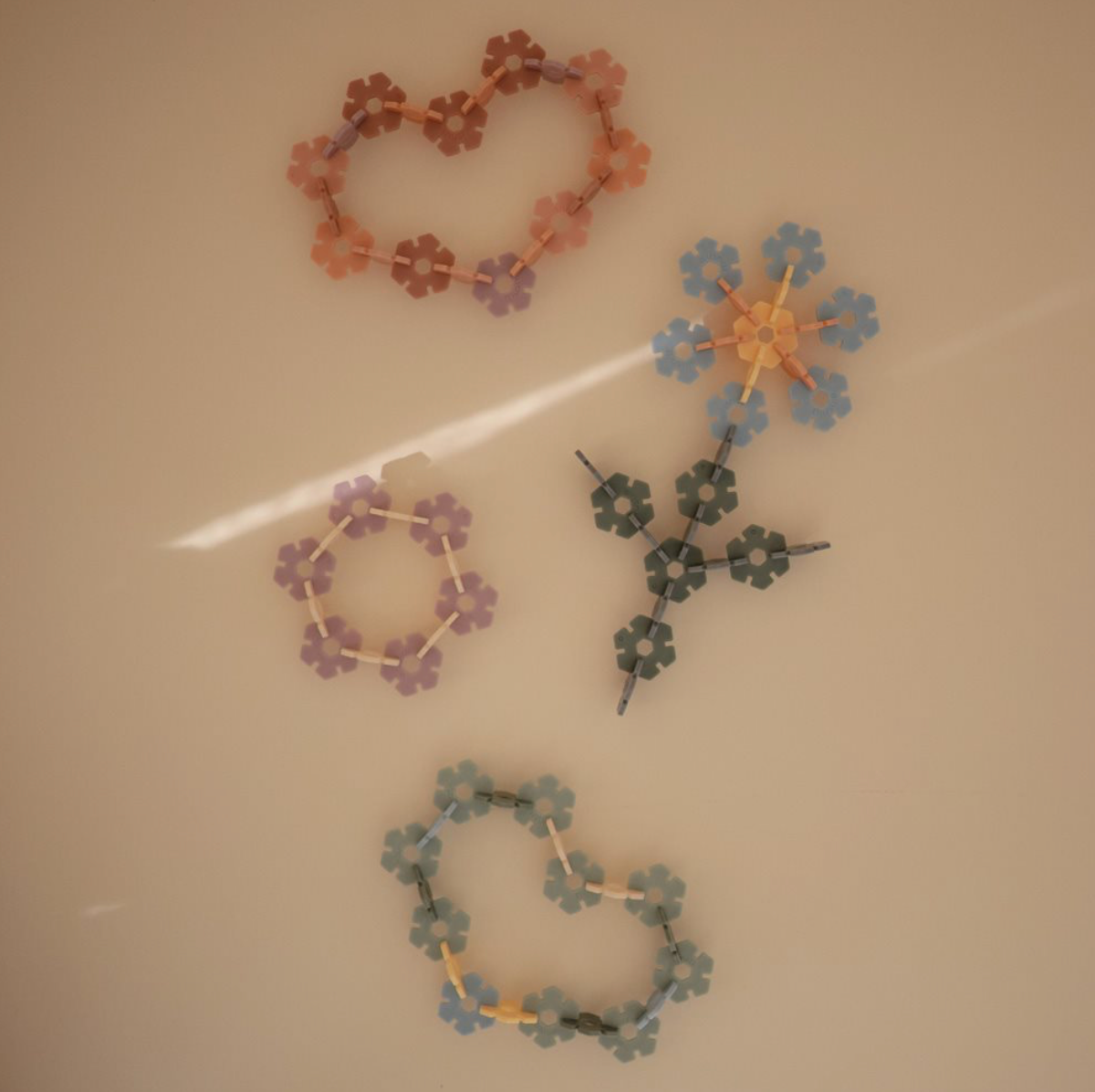 Give littles the tools to learn problem solving skills and develop spatial reasoning with this STEM (science, technology, engineering, and math) toy designed to encourage creativity. Our open ended building toy set features 100 hexagon shaped discs that piece together with endless possibilities. Each time littles play, the soft colours blend to create beautiful and unique designs while the BPA-free plastic pieces interlock with ease.