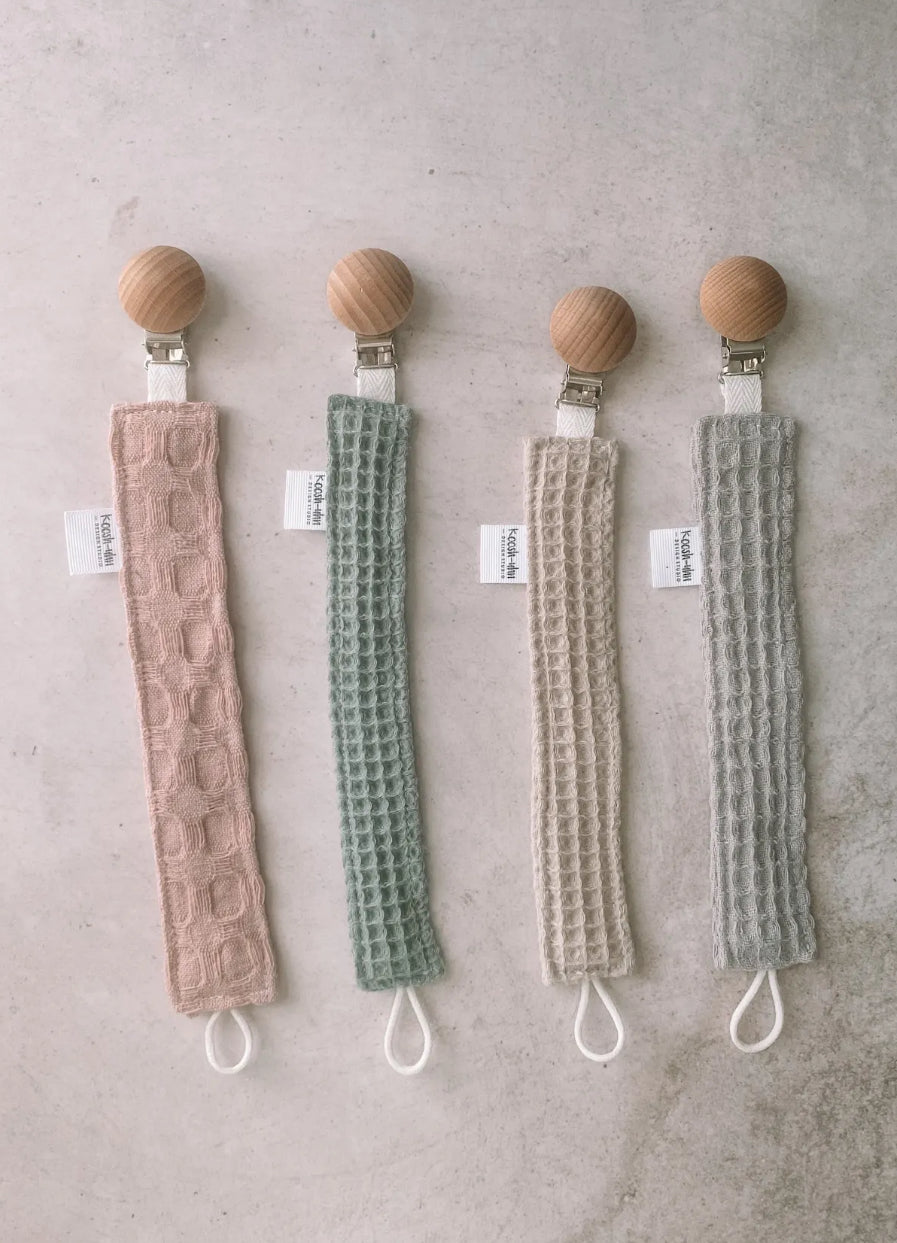 Made from cotton waffle weave and a beechwood clip, this is the perfect accessory that combines practicality and style to secure your baby’s pacifier.