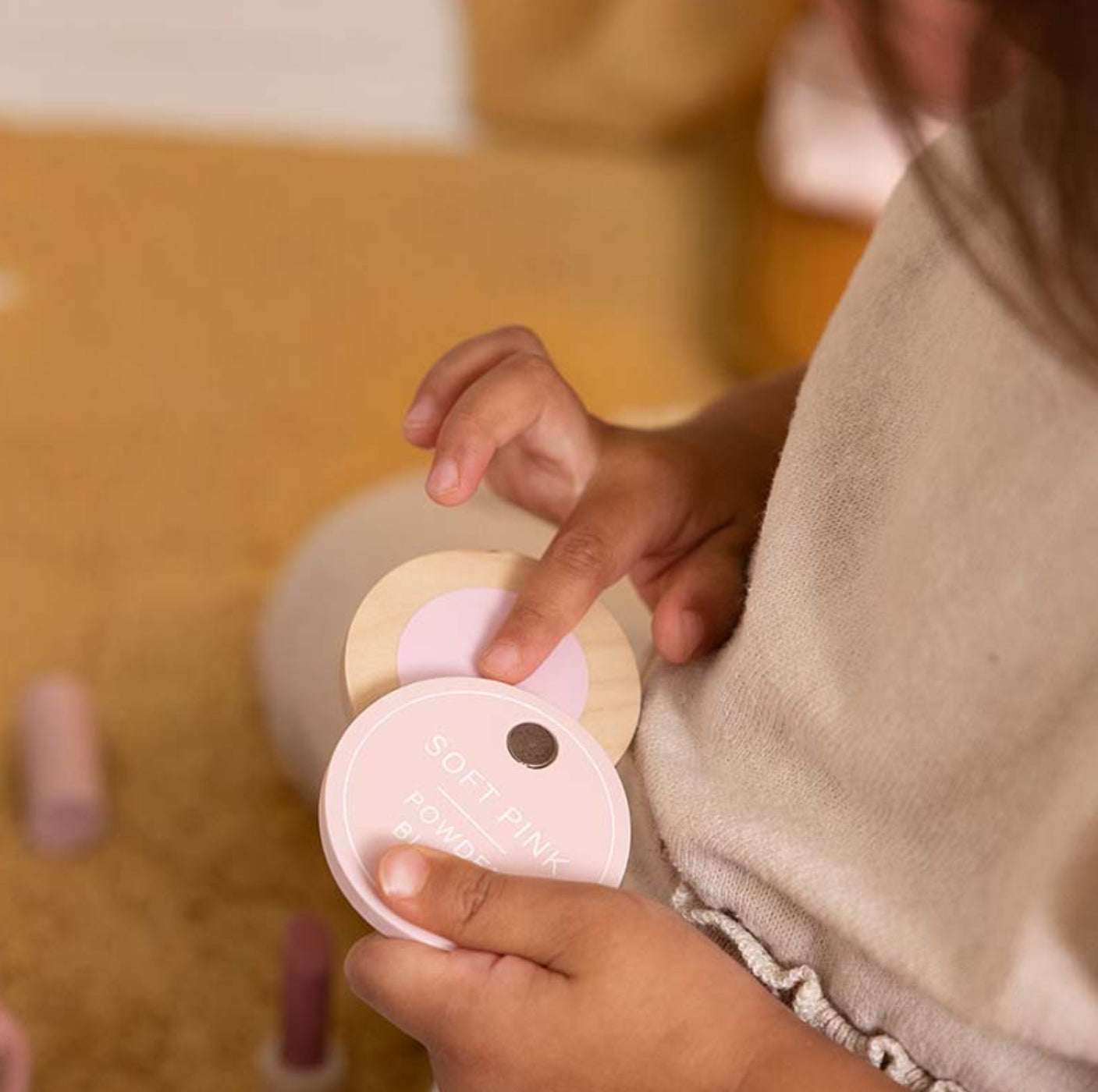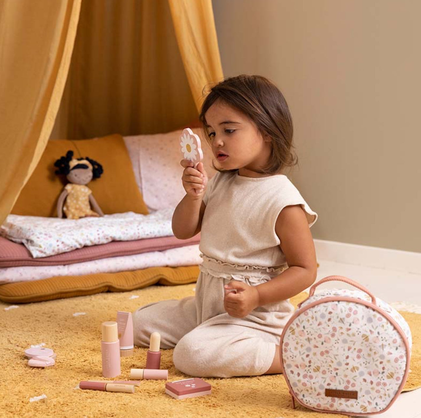 The set also consists of lipstick, nail polish, face powder, powder puff, eye shadow, mascara and a nail file. This Little Dutch beauty case allows all the fun, but not the mess of real make-up!