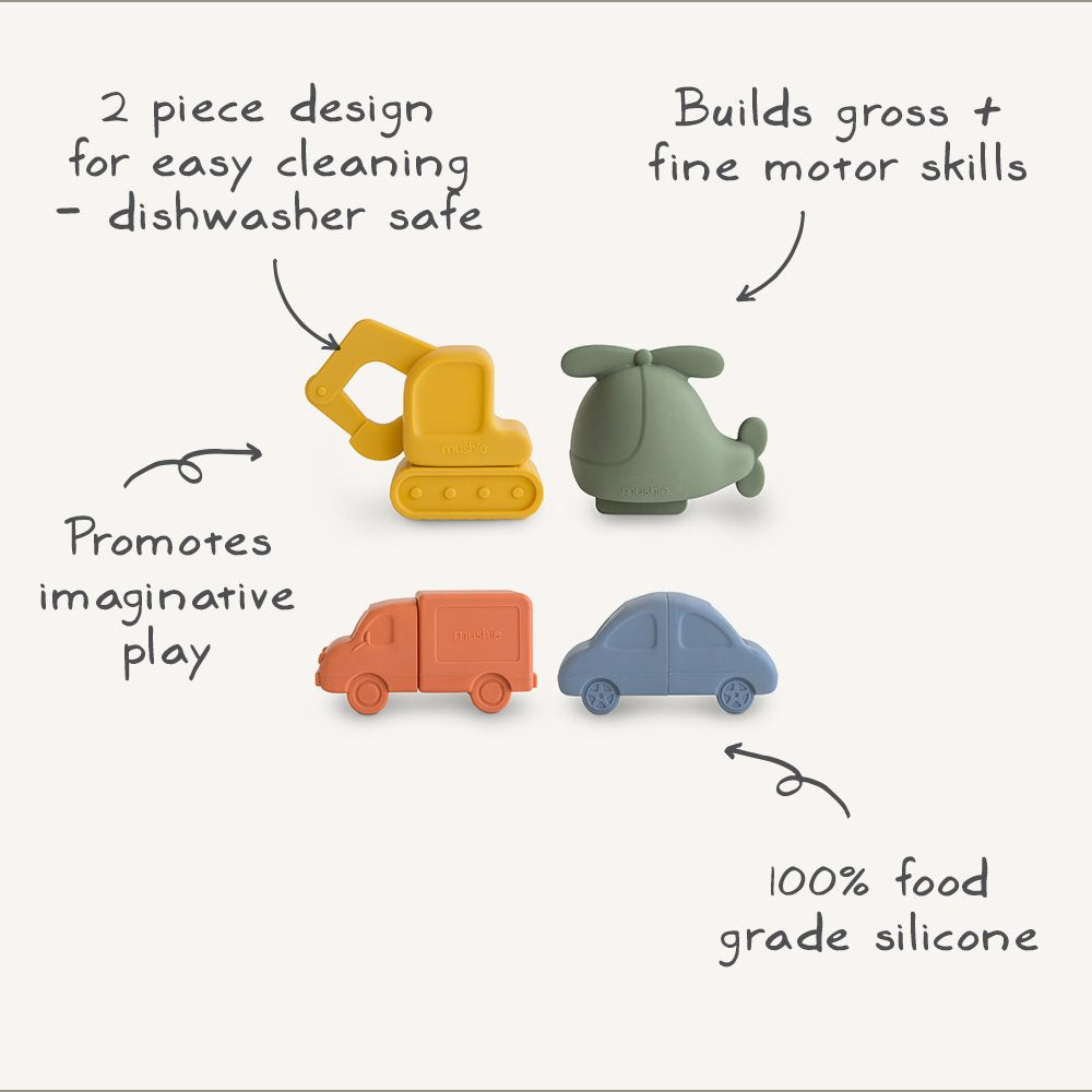 The Vehicles Bath Play Set 4-pack is a set of water-friendly toys that can be safely used in the tub. The set consists of 4 little vehicles in food-grade silicone: a helicopter, car, truck and excavator which are made to stimulate children’s senses and promote their cognitive development.