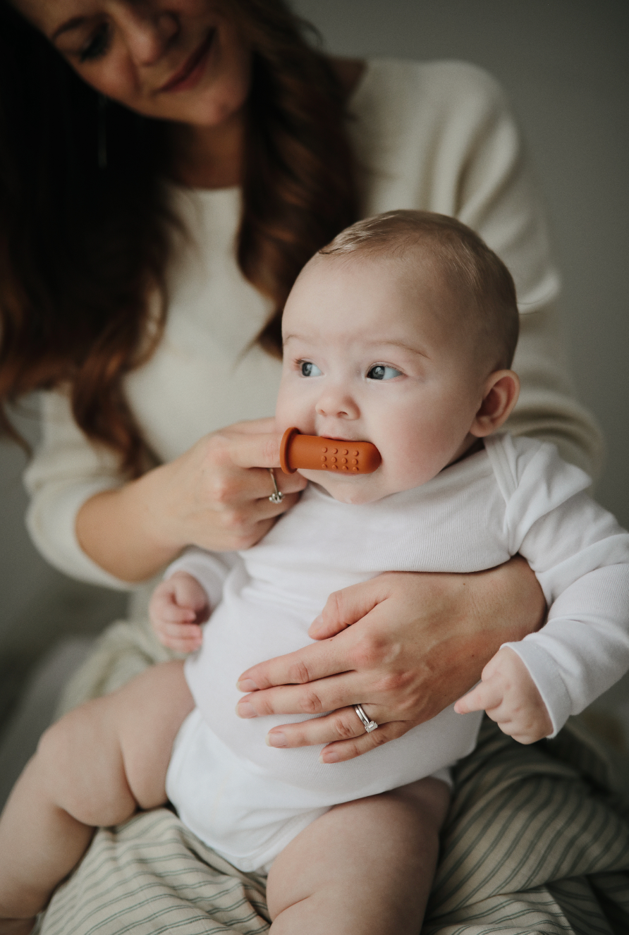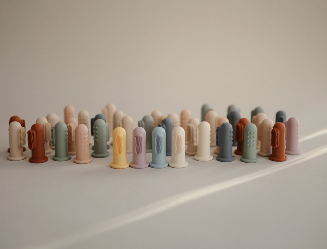 Brush bacteria away from your baby’s gums with a finger toothbrush from Mushie!